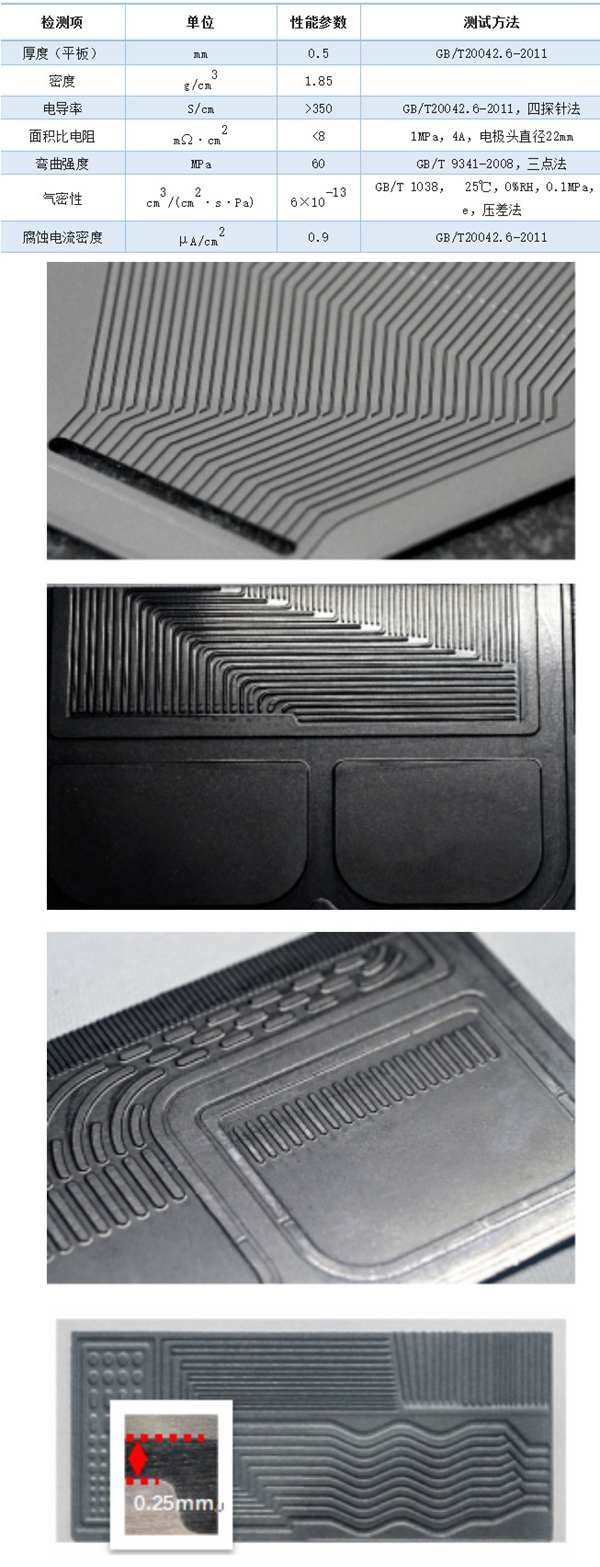 我司主導產(chǎn)品為高性能碳基復合雙極板,可廣泛應(yīng)用于氫燃料電池、液流電池、電解水等領(lǐng)域。碳基復合雙極板相較于傳統(tǒng)的石墨雙極板與金屬雙極板,可以做到兼顧二者優(yōu)點的同時規(guī)避二者的短板:其采用的模壓成型的工藝在生產(chǎn)效率上遠遠優(yōu)于石墨板,而在流道構(gòu)型及成型特點方面也比金屬板適應(yīng)性更廣。當前,我司自主研發(fā)的復合雙極板基礎(chǔ)性能如下: