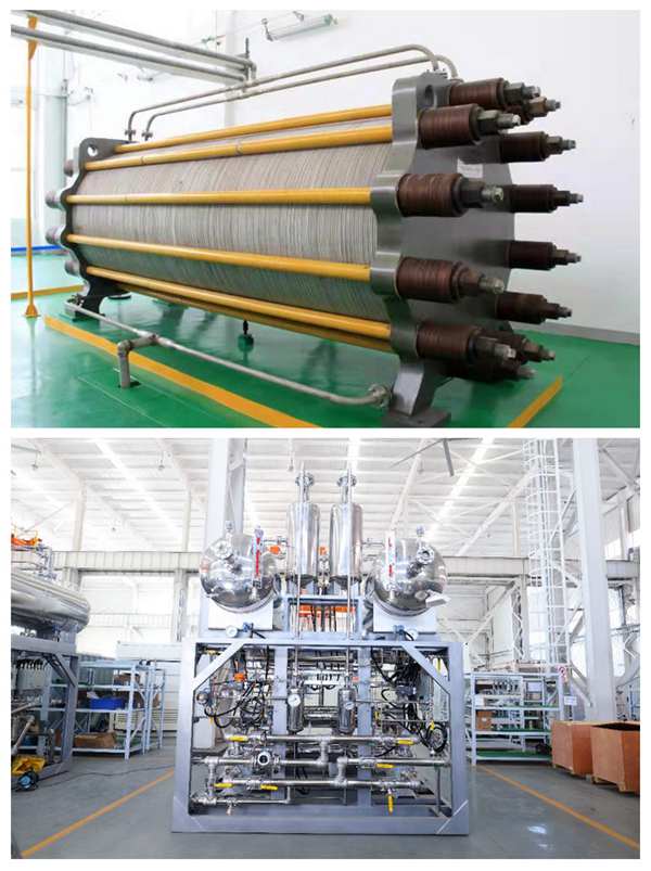 純水型電解制氫裝置系列是近年來(lái)自主研發(fā)的新型綠色水電解制氫系統(tǒng),單臺(tái)電解槽產(chǎn)氫量為0.01~300Nm³/h,除適用于傳統(tǒng)工業(yè)領(lǐng)域外,還可適用于可再生能源發(fā)電制氫、氫能基礎(chǔ)設(shè)施加氫站制供氫、天然氣摻氫等技術(shù),在交通領(lǐng)域、電網(wǎng)儲(chǔ)能、智能微電網(wǎng)以及軍用領(lǐng)域得到廣泛應(yīng)用。該裝置的關(guān)鍵技術(shù)涵蓋了核心功能材料高性能催化劑、膜電極的制備技術(shù);高溫高壓下腐蝕機(jī)理及其腐蝕防護(hù)技術(shù);高性能流場(chǎng)極板設(shè)計(jì)和加工技術(shù);智能模塊化設(shè)計(jì)和系統(tǒng)集成技術(shù)等。產(chǎn)品氫氣純度達(dá)到99.999%,氧氣純度達(dá)到99.2%。