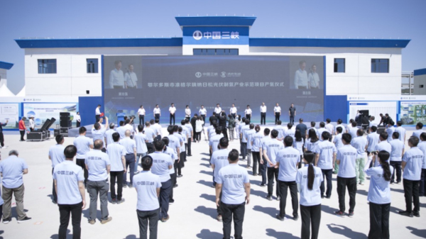 納日松項目是內(nèi)蒙古自治區(qū)第一批風光制氫一體化示范項目,是鄂爾多斯、內(nèi)蒙古自治區(qū)、全國乃至全球首個最大的萬噸級新能源制氫項目,由中國三峽新能源(集團)股份有限公司與滿世投資集團有限公司合資建設。項目利用采煤回填區(qū)建設光伏電站,年均發(fā)電量約為7.4億千瓦時,其中20%將直接輸送至當?shù)仉娋W(wǎng),剩余80%用于綠氫生產(chǎn)。項目安裝15套1000標方/小時的堿性電解制氫裝備,年產(chǎn)氫氣約1萬噸、氧氣約8萬。