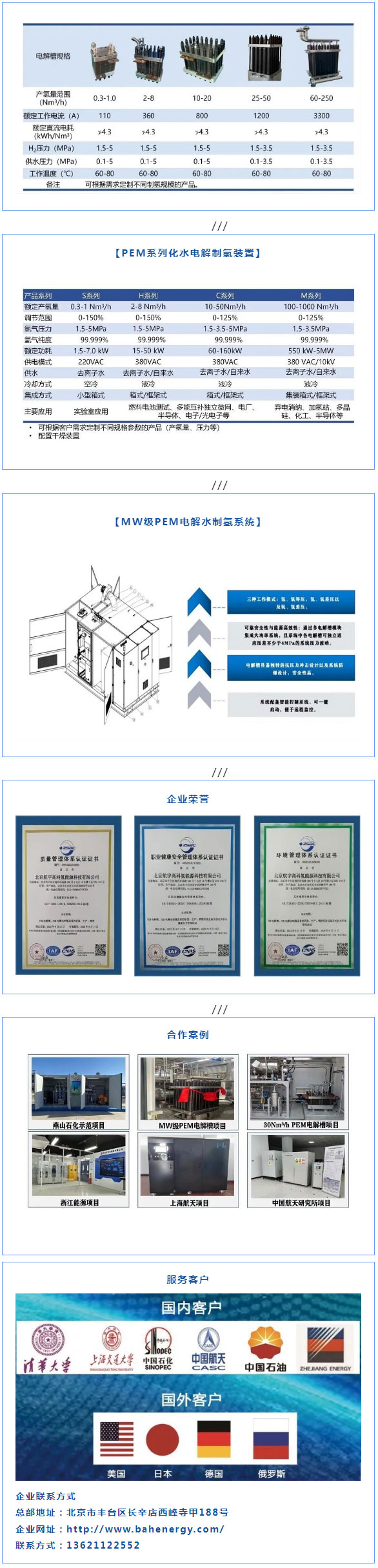 公司的研究及工程技術(shù)團隊積累了二十多年航天電解水制氫應用研究和技術(shù)開發(fā)經(jīng)驗,具備全方位產(chǎn)品持續(xù)升級迭代的研發(fā)能力,單電解槽產(chǎn)氫量可覆蓋0.3-250 Nm3/h全范圍,其中MW級單槽PEM電解槽的產(chǎn)業(yè)化和商業(yè)應用,解決了可再生能源制取綠氫的“卡脖子”關鍵技術(shù),填補了國內(nèi)空白。產(chǎn)品已成功服務于中石化、中國航天、中石油、浙能、清華、上海交大以及美國、日本、德國等眾多重點客戶。
