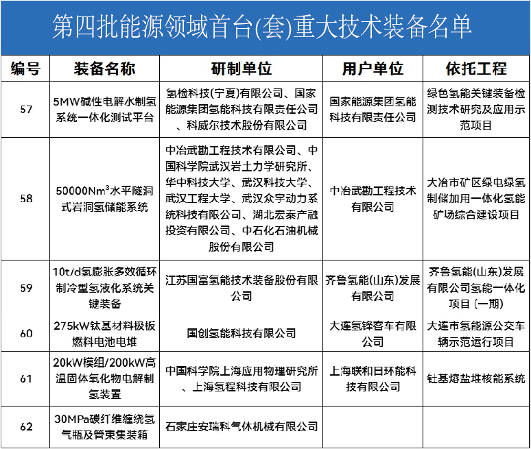 根據(jù)《第四批能源領域首臺(套)重大技術裝備名單》,其中6項氫能技術裝備入選。這6套分別為一套5MW堿性電解水制氫系統(tǒng)測試平臺、一套巖洞氫儲能系統(tǒng)、一套10t/d氫膨脹氫液化系統(tǒng)關鍵裝備、一套275kW鈦基材料極板燃料電池電堆、20kW模組/200kW高溫固體氧化物電解制氫裝置、以及一套30MPa碳纖維纏繞氫氣瓶及管束集裝箱。