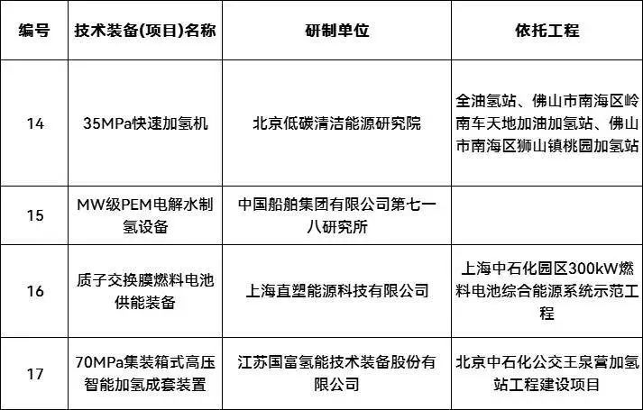 2022年并未統(tǒng)一公布第二批能源領域首臺(套)重大技術裝備項目,只發(fā)布了2021年度能源領域首臺(套)重大技術裝備項目。在所有75個裝備(項目)中,35MPa 快速加氫機、MW 級PEM電解水制氫設備、質(zhì)子交換膜燃料電池供能裝備和70MPa集裝箱式高壓智能加氫成套裝置4個裝備(項目)入選。