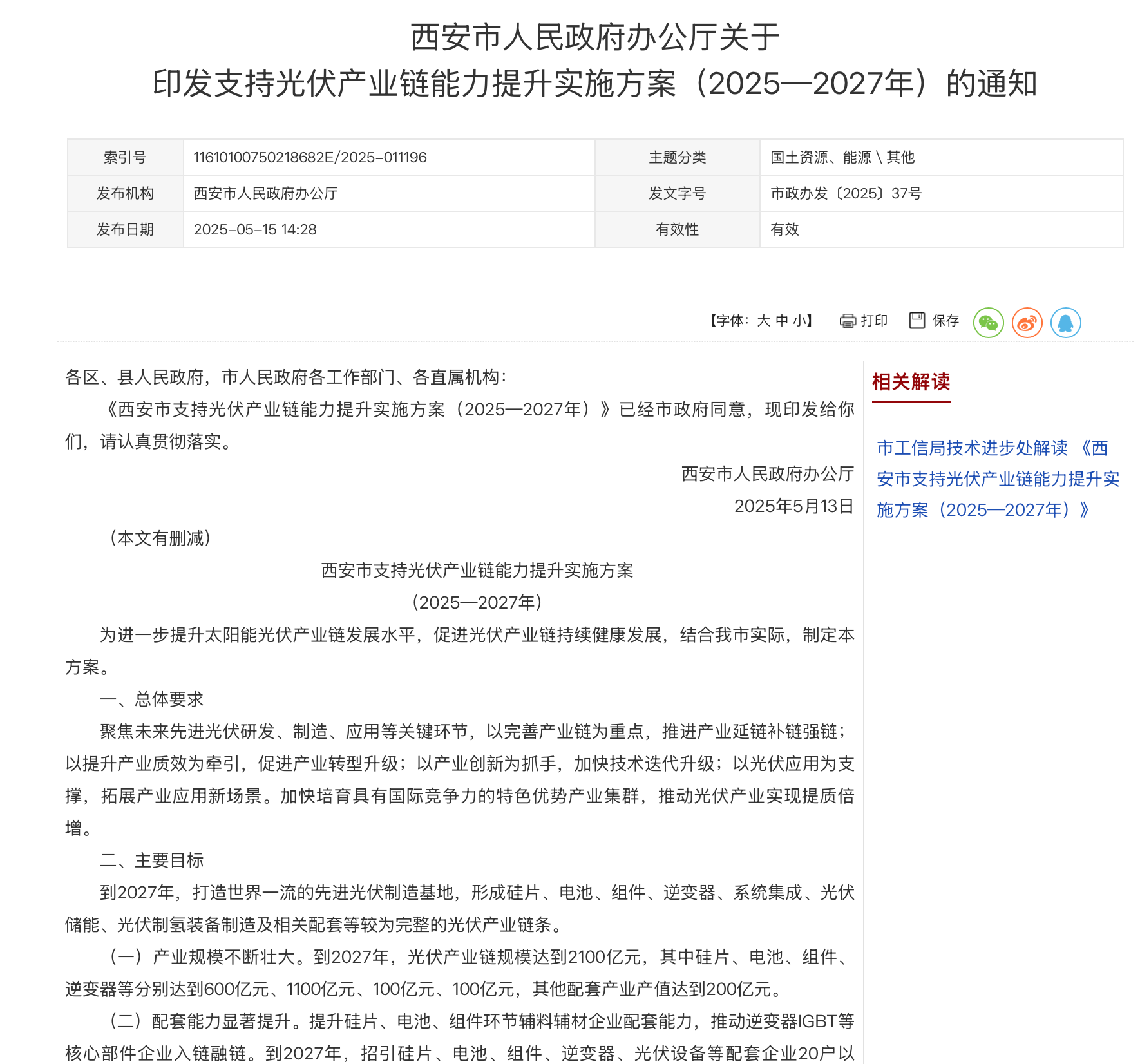 據(jù)西安市人民政府官方網(wǎng)站發(fā)布的消息,《西安市支持光伏產(chǎn)業(yè)鏈能力提升實施方案(2025—2027年)》(以下簡稱“《方案》”)于5月15日正式印發(fā)。