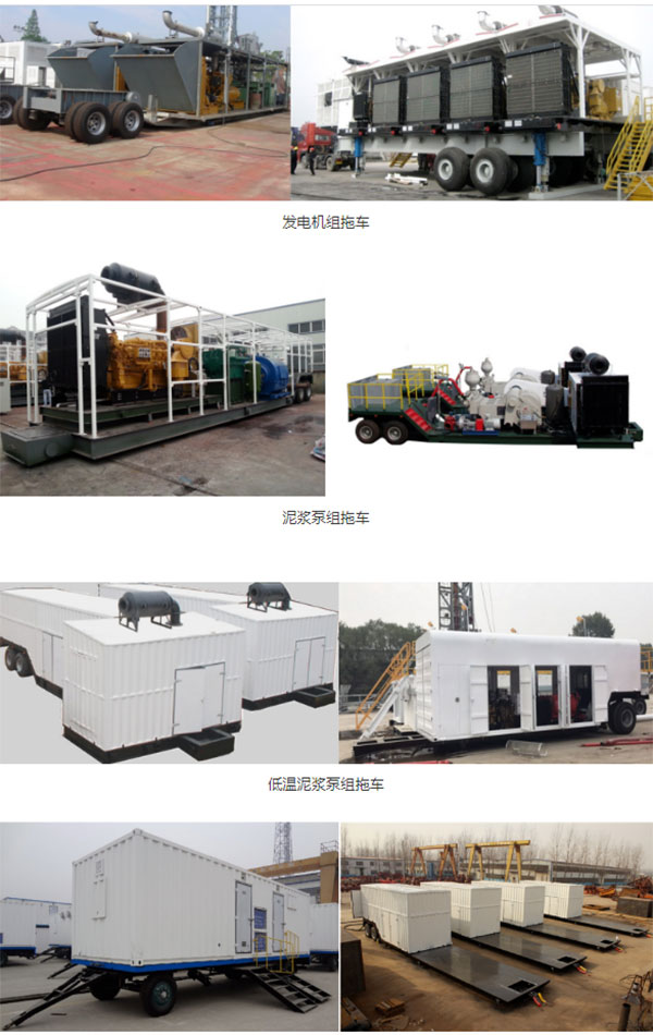 該系列拖車主要用來整體運輸鉆機現(xiàn)場泥漿泵組、發(fā)電機組、氣源房、固控系統(tǒng)、油水罐等設(shè)備。可以實現(xiàn)設(shè)備的整體快速搬遷。