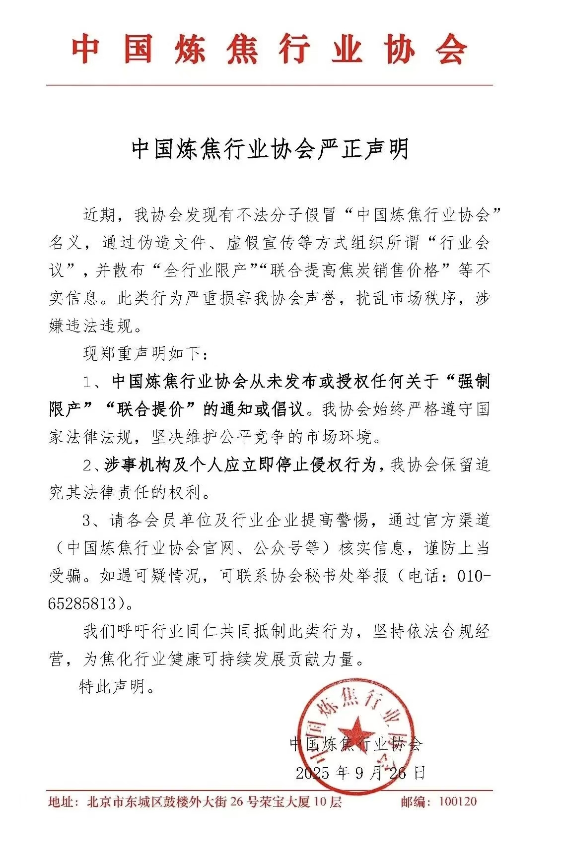 中國(guó)煉焦行業(yè)協(xié)會(huì)辟謠:從未發(fā)布“強(qiáng)制限產(chǎn)”等通知